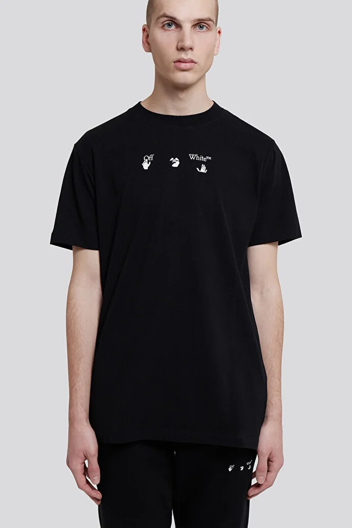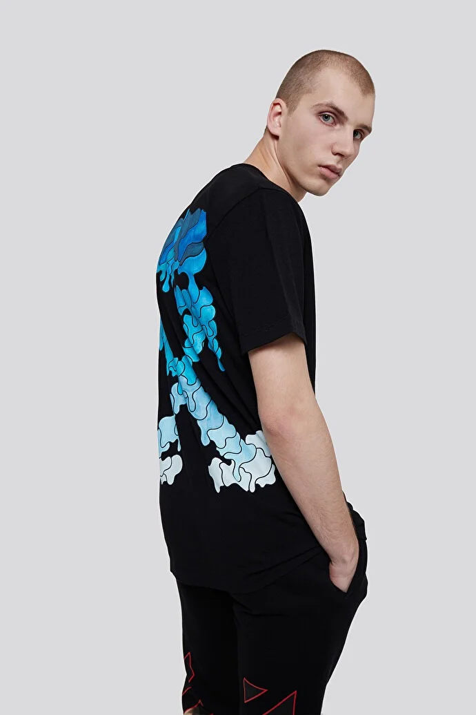 This Off-White black short-sleeve T-shirt features the brand’s iconic arrow motif reimagined in a blue gradient drip design on the back. Crafted from premium cotton for a comfortable fit, the shirt offers a casual yet elevated streetwear style. Perfect for pairing with jeans or joggers, it’s a standout piece for any Off-White enthusiast.